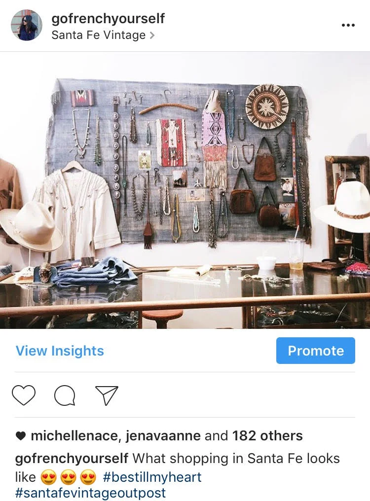 Santa Fe Vintage Outpost: This is a swoon worthy experience for anyone who has style. The curated vintage clothing and collectibles is just divine. The Outpost is located at 202 East Palace Avenue just 2 blocks off the historic downtown plaza. This location features a pared-down collection of Scott Corey's large Santa Fe Vintage. This is the place to shop for amazing pieces like flannels, jean jackets, gold-rimmed aviators and African indigo Mali cloth pieces. The shop showcases both vintage jewelry and gorgeous pieces by co-winer Julienne Barth. You can also contact Scott Corey to make an appointment to shop his main showroom and Santa Fe's best-kept fashion secret with BIG name designers making pilgrimages to his warehouse to source denim, cowboy boots and Southwest antiques. And I am accepting all Christmas presents from here too!