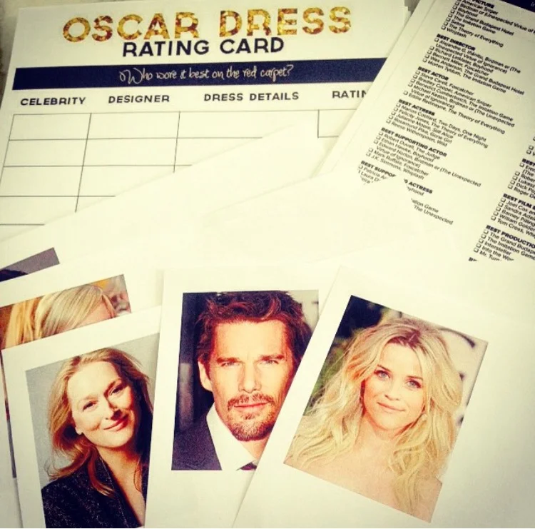 You can also print off an Oscar dress rating card! This is a really brilliant fun idea to interact with the red carpet portion of the event ! You can list the actress and the designer of their dress and the things you loved or hated. Make sure to have enough ink pens or pencils handy!