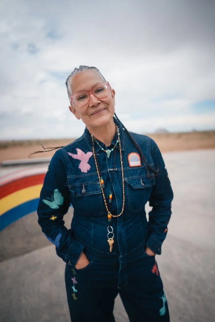 The designs you’ll find at 4kinship are truly stunning. Amy draws inspiration from the natural elements in New Mexico. In addition, 4kinship has partnered with various community efforts like providing mutual aid during covid to the Navajo Nation, supporting domestic abuse shelters, and fundraising for the Dine Skate Garden Project which I will tell you more about in a bit.