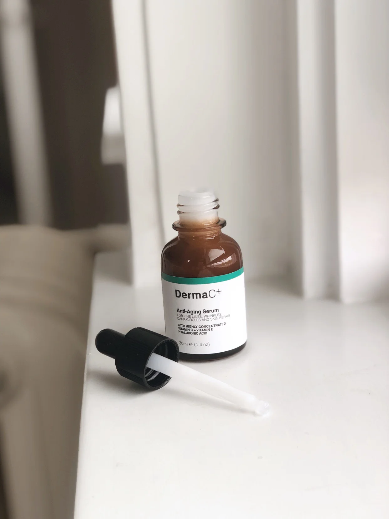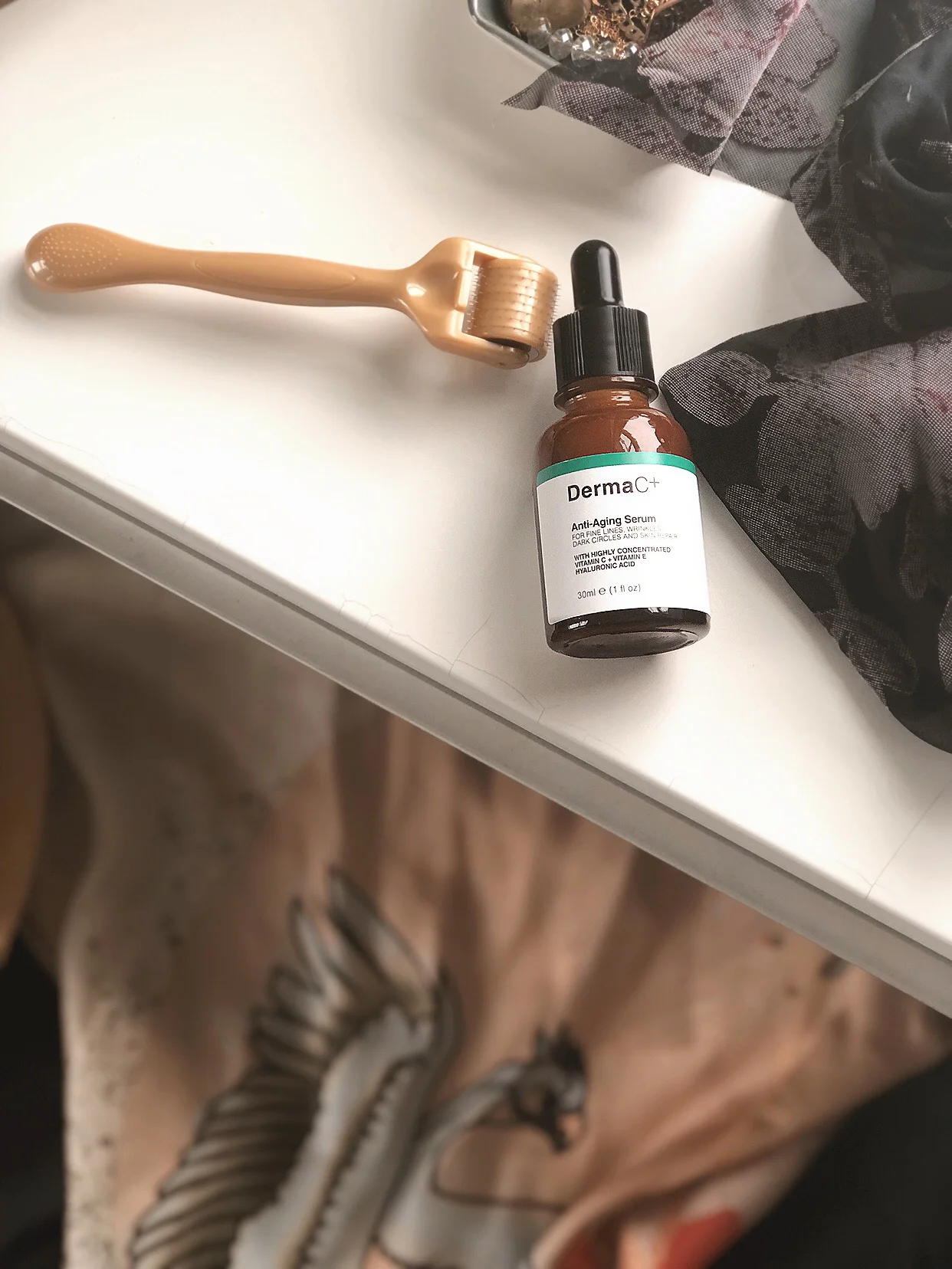 After rolling the Derma Roller across your face (according to the instructions on your specific roller), you should always apply an anti-aging serum to your face. I love the DermaC+® Anti-Aging Serum. This gem is highly concentrated with vitamin C (creates elastin and collagen) and vitamin E (antioxidant and moisturizer), and minimizes the appearance of deep wrinkles and reduces the look of age spots and discoloration. It’s really my miracle potion! The effectiveness of DermaC+ is greatly enhanced when used after treatments with the Derma Roller.