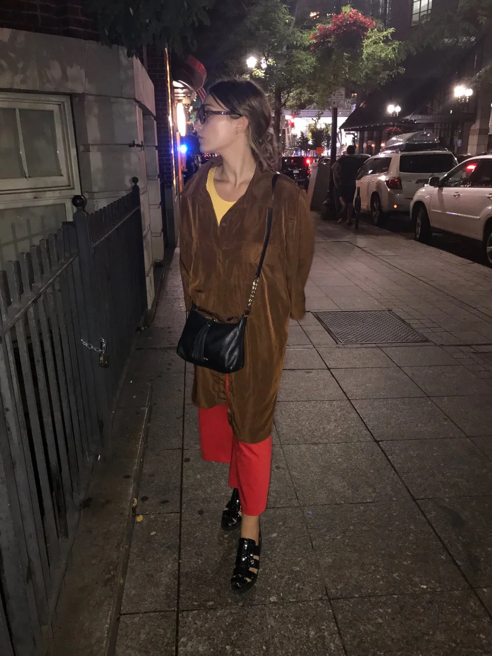 My night out outfit would be suited with a graphic tee (most likely my Terminator shirt I thrifted from the little boys section) under a blazer or duster with wide-legged colored pants and an angular heel.