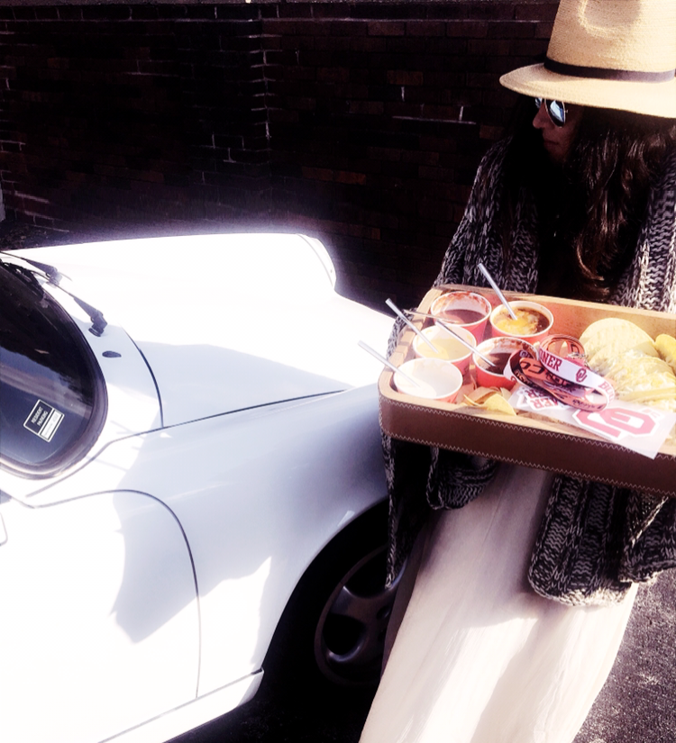 Each box includes eight Crispy Beef Party Tacos or eight Chicken or Beef Taquitos, four large bags of chips and five large dips, including Queso, refried beans, jalapeño ranch, firehouse salsa and Taco Bueno’s signature red salsa. Everything you need for an awesome tailgating party! And in true Samantha style--I dressed mine up for game day last weekend for a small little tailgate gathering with a few friends. I mean are you at all surprised here?! This leather serving platter was the perfect size! Lin also made his perfect guacamole and I made some sangria popsicles. Everything was perfect for this little Tex-Mex party cheering on our teams!